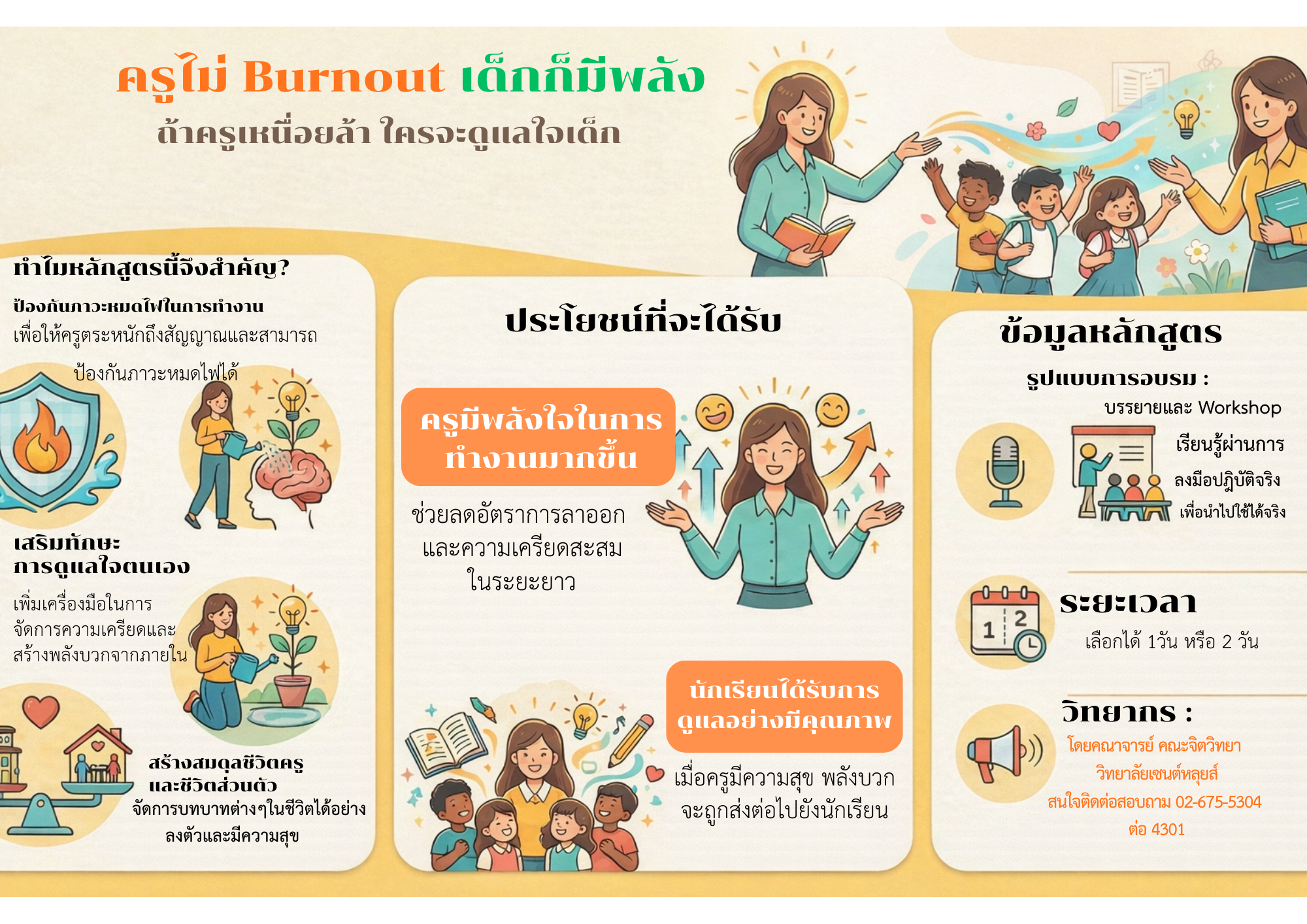 คณะจิตวิทยา วิทยาลัยเซนต์หลุยส์ เปิดอบรม หัวข้อ “ครูไม่ Burnout เด็กก็มีพลัง” สนใจติดสอบถามได้ 02-675-5304 ต่อ 4301